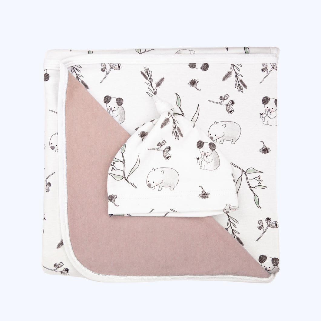 Introducing the cute and cuddly Organic Baby Blanket with an original Australiana pattern designed by Mosov Mini, featuring friends, Sleepy Little Koala and Hungry Little Wombat.